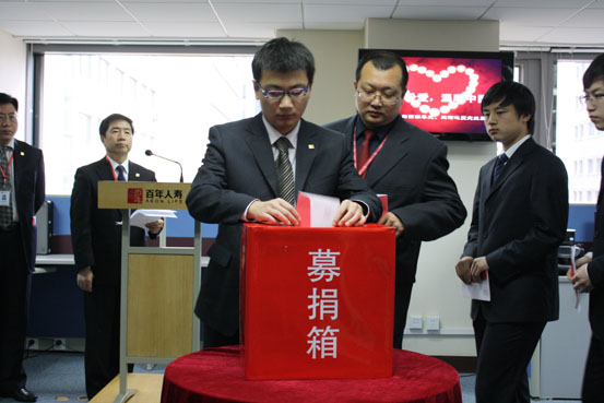 为了切实帮助灾区同胞,百年人寿公司总裁室向全体员工发出了“为西南旱灾、玉树地震灾区人民募捐的倡议”,号召大家一起行动起来,为灾区同胞尽一份力,支援灾区人民渡过难关。4月21日,总公司举行了特殊晨会,监事会王新权主席主持了“为西南旱灾、玉树地震灾区人民现场募捐仪式”,在何勇生董事长的带领下,公司管委会领导率先献出了爱心,员工们也积极踊跃地将自己的爱心捐款投入了募捐箱中。