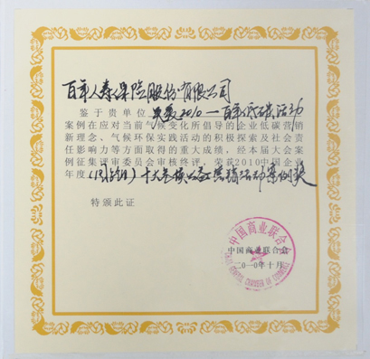 2010年10月24日,中国企业财富创造与气候变化应对责任高峰论坛暨中国企业气候公益营销活动案例评选活动在北京隆重举行。相关部委领导、商界领袖及学者集聚一堂,围绕气候变化和低碳环保这一全球热点问题进行了精彩演说。在评选颁奖过程中,以百年人寿、国航为代表的优秀企业荣获“十大气候公益营销活动案例奖”,一度将会场气氛带向高潮。