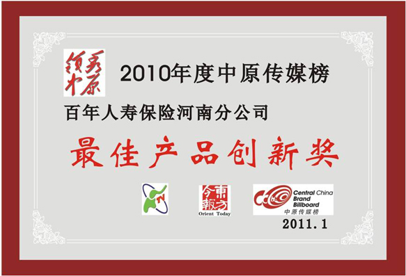 2011年1月15日,“领秀中原.2010中原传媒榜”颁奖盛典在河南电视台1500平方米演播厅隆重举行。百年人寿河南分公司凭借开业以来在创新、成长等方面取得的突出成绩,荣获“2010年度最具成长性机构”奖项,申报的“百年富贵年金保险(分红型)”凭借出色的功能和创新能力,得到市场和专家的高度认可,荣获“2010年度最佳产品创新奖”殊荣。