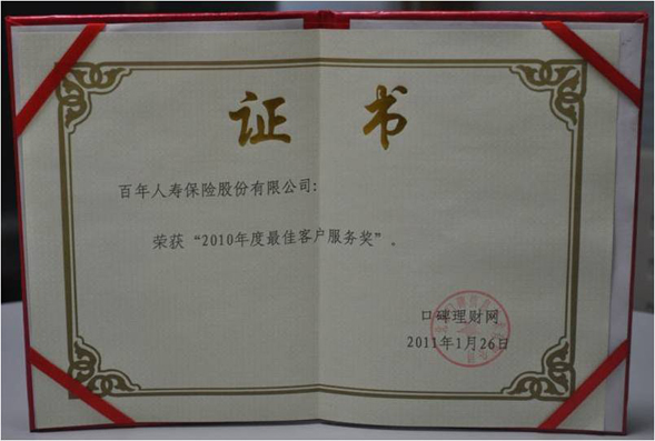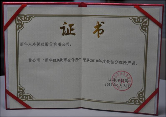 1月26日,国内首个以用户体验为主要评价基础的金融理财榜单“2010年中国金融理财产品服务口碑榜”在京揭晓,工商银行、百年人寿、华夏基金等金融机构分别获得了相关行业的口碑大奖。其中百年人寿荣获“年度最佳客户服务金融机构”,百年人寿“百年红两全保险(分红型)D款”获“年度最佳分红险产品”奖项。