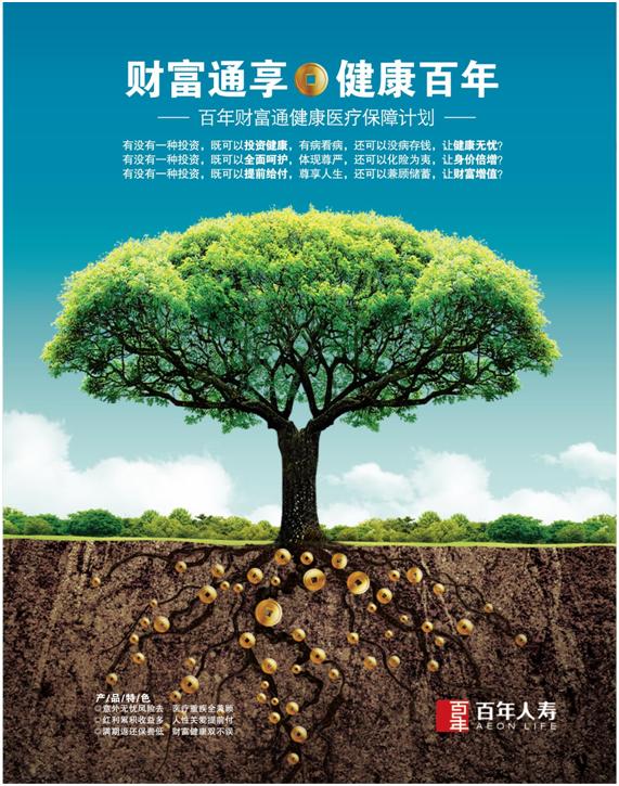 “百年人寿财富通医疗保障计划”具有四大特色:一、风险无忧保障“全”。兼顾意外保障、医疗补贴、残疾保障、重大疾病提前给付,是一个全方位的人身保障计划。被保险人如果在65周岁及以前意外身故或者全残该产品将按照3倍保额给付保险金,更加体现人性关爱。二、健康呵护费用“免”:住院有津贴,且费用低廉,利用产品的分红可以弥补所交的住院津贴保险费,相当于免费获得住院津贴,每年最高可达365天。三、分红累计收益“快”:该产品具有分红功能,累积生息,长期的收益也很可观,为人生储存一份健康基金。四、满期返还资金“涨”:满期后返还“财富通”保额,该保额高于所交保费,有病治病,没病当养老金。交费期也很短,只需要5年或者10年。与其它保险一样,客户可以根据自己的需求与其他附加险同时购买,满足人生不同阶段的需求。